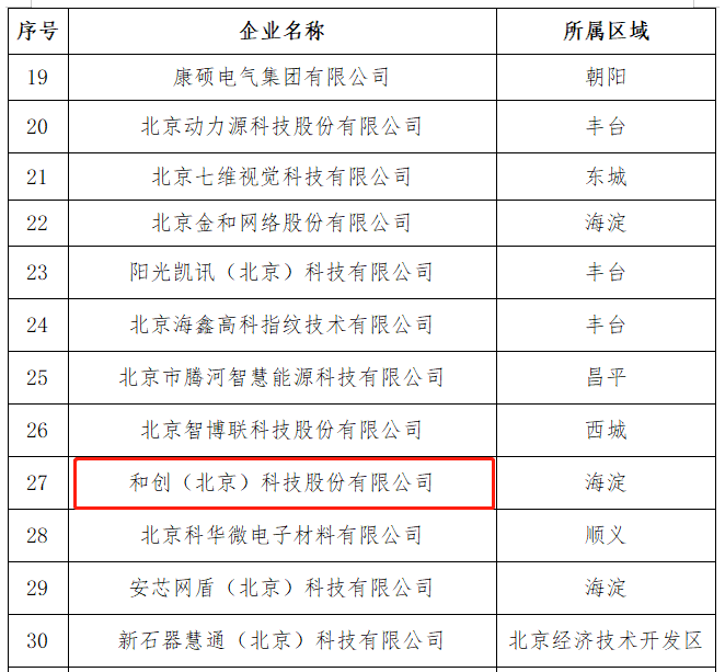 2021 年 10 月 29 日,北京市經(jīng)濟和信息化局將北京市 2021 年度第六批擬認定“專精特新”中小企業(yè)名單予以公示,和創(chuàng)(北京)科技股份有限公司榮登榜單,此次公示期為 10 月 29 日至 11 月 4 日,目前已通過公示期。 根據(jù)北京市經(jīng)濟和信息化局的評審程序的有關(guān)規(guī)定,對于公示期無異議的,認定為“北京市‘專精特新’中小企業(yè)”。
