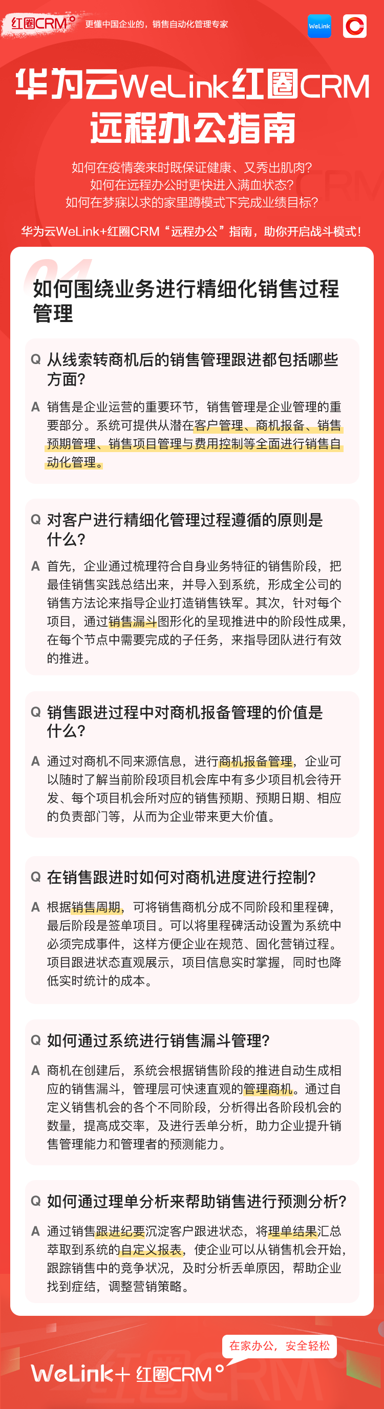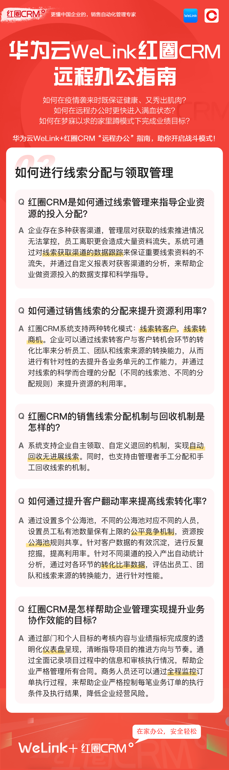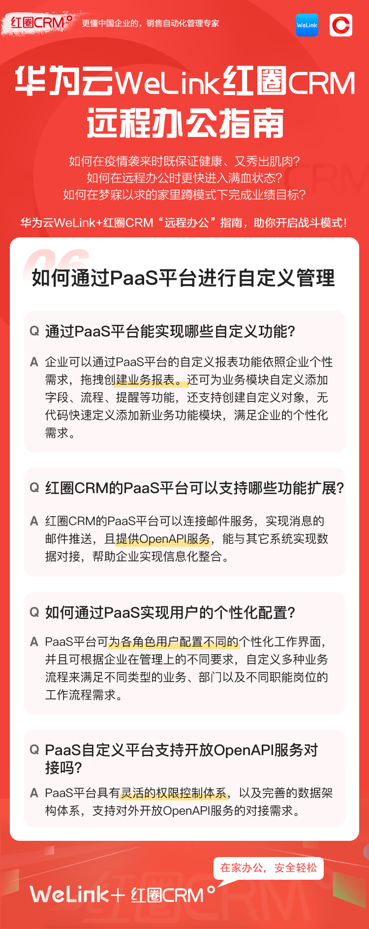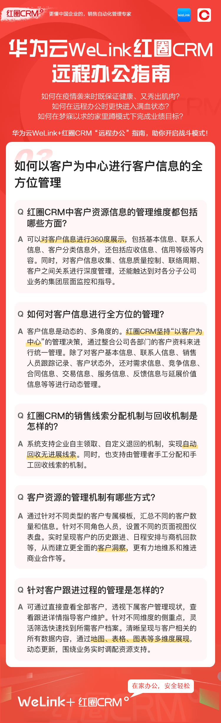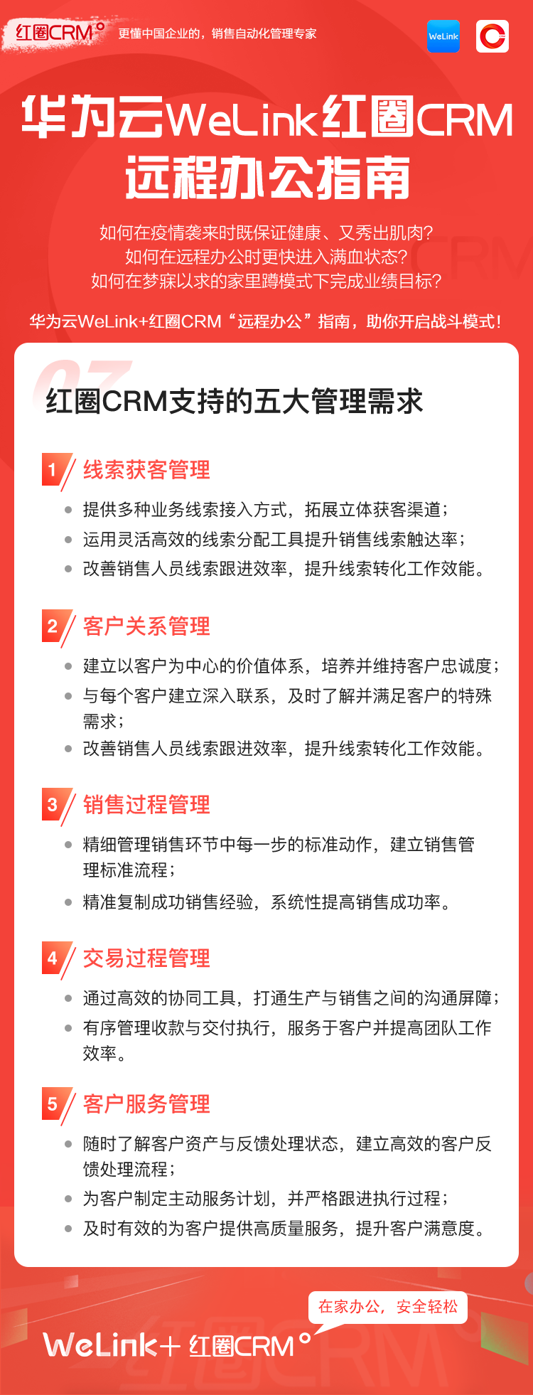如何讓在家辦公安全、輕松、高效?華為云WeLink攜手紅圈CRM提供了安全、智能、開放的移動辦公解決方案,并提供免費的在線視頻會議服務(wù),請您收好這份遠程移動辦公寶典!