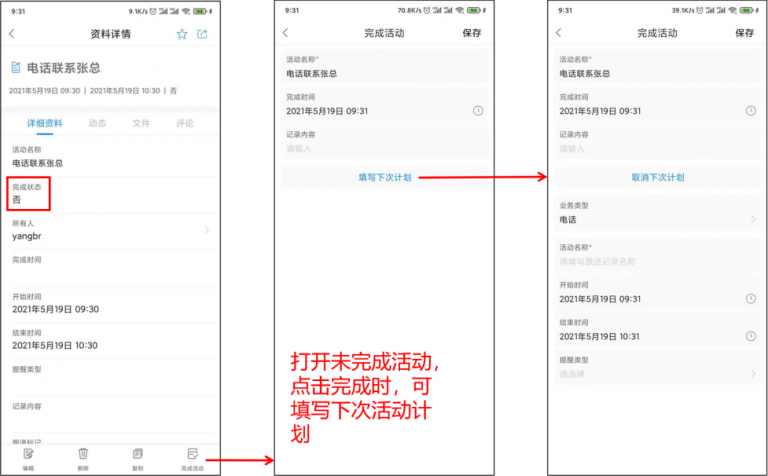 填寫的下次計劃,類型和當(dāng)前活動類型一致,可修改