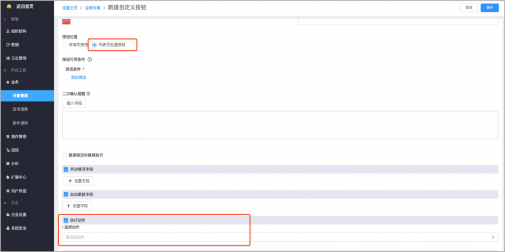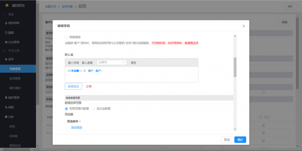 可以選擇下游對象和相關(guān)操作,其中資料編輯需勾選具體字段,可選范圍是下游對象字段追蹤里的字段