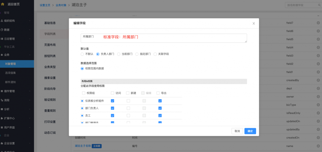 - 系統(tǒng)字段及按鈕修改權(quán)限配置:系統(tǒng)字段、標(biāo)準(zhǔn)字段(所屬部門及負(fù)責(zé)人)、按鈕支持在編輯時修改權(quán)限