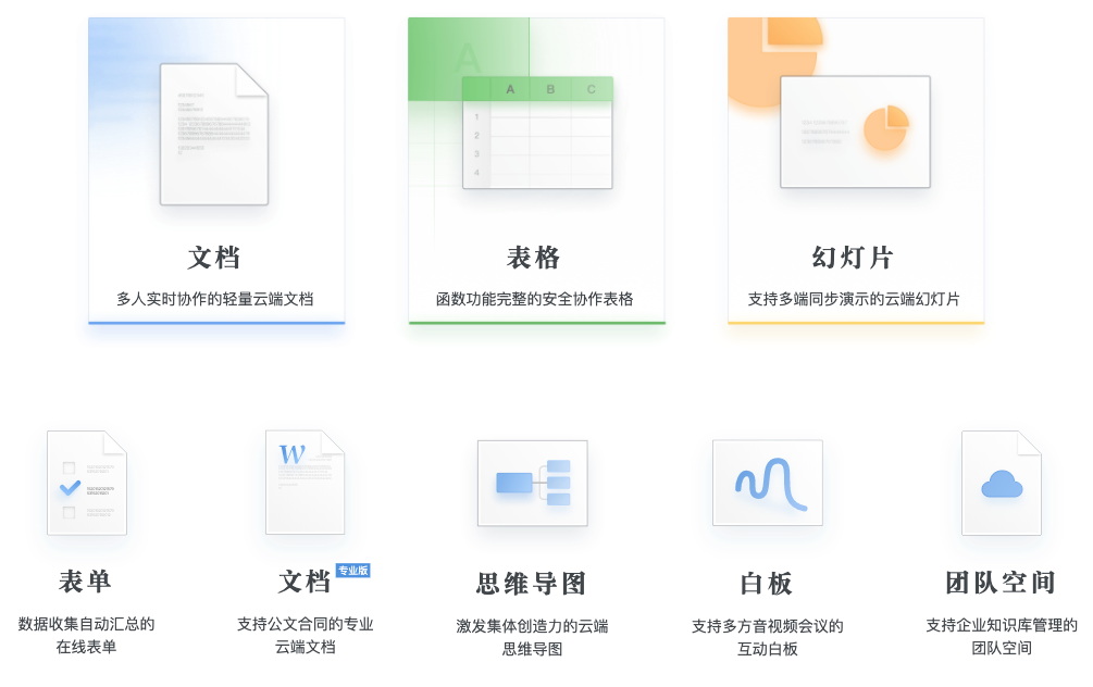 石墨文檔發(fā)展至今,已有產(chǎn)品線包含文檔、表格、表單、幻燈片、思維導(dǎo)圖、白板、團(tuán)隊空間等,基本可以滿足企業(yè)辦公場景中的常見需求。