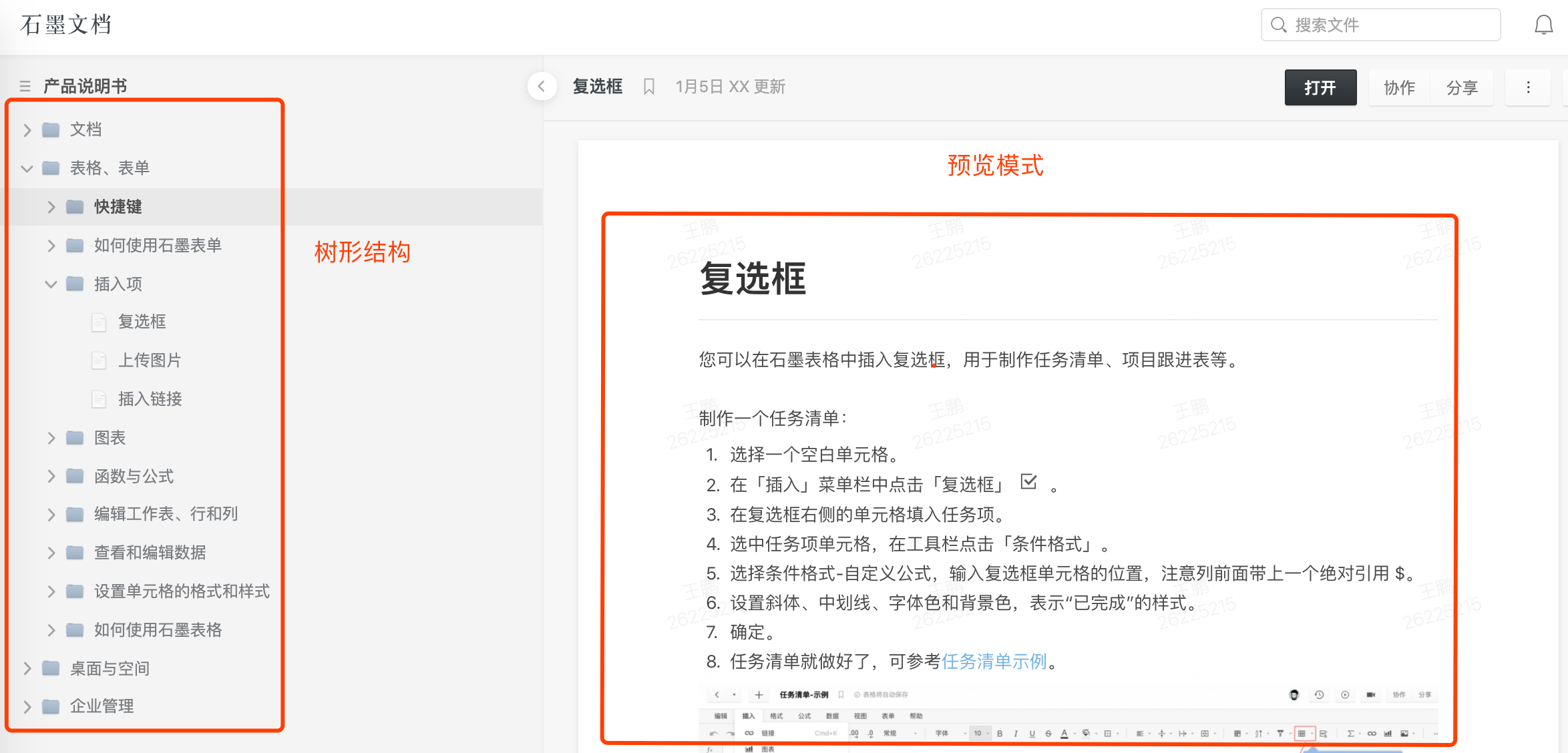 石墨的樹形結(jié)構(gòu)還提供預(yù)覽模式,用戶可直接在左側(cè)的空間目錄點擊文件夾或文件,右側(cè)實時預(yù)覽,查看文件內(nèi)容。