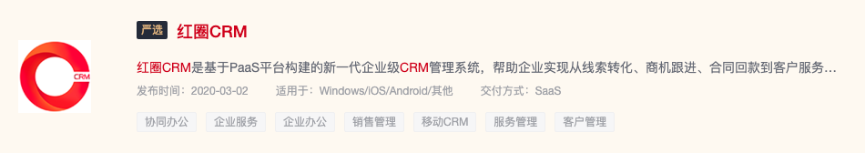 紅圈CRM是基于紅圈獨(dú)立研發(fā)的PaaS平臺(tái)上構(gòu)建的企業(yè)級(jí)SaaS移動(dòng)銷(xiāo)售管理云服務(wù)系統(tǒng),具備高度的靈活擴(kuò)展能力,能夠幫助企業(yè)實(shí)現(xiàn)從線(xiàn)索轉(zhuǎn)化、商機(jī)跟進(jìn)到回款管理等LTC銷(xiāo)售全流程的精準(zhǔn)管理,有效支撐企業(yè)復(fù)雜的業(yè)務(wù)場(chǎng)景需求及業(yè)務(wù)變化。通過(guò)面向客戶(hù)業(yè)務(wù)的數(shù)字化升級(jí)需求場(chǎng)景構(gòu)筑了在移動(dòng)辦公、溝通協(xié)作、銷(xiāo)售與營(yíng)銷(xiāo)等業(yè)務(wù)場(chǎng)景解決方案,幫助企業(yè)實(shí)現(xiàn)了高效的團(tuán)隊(duì)協(xié)作,大幅提升了組織效能,更加全面地推進(jìn)了業(yè)務(wù)進(jìn)步。