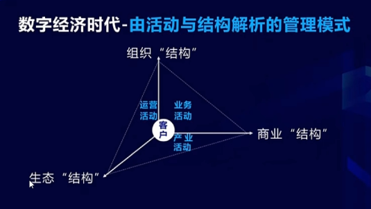 我們對于今天任何一個企業(yè)的數(shù)字化轉型,大家記住,跟工業(yè)時代不太一樣的是你得完成三個結構:一個結構是現(xiàn)在有的組織架構,一個是你跟顧客關系的商業(yè)結構,還有一個是你跟產業(yè)關系的生態(tài)結構。你必須得三個結構都做到。如果你沒有能力,從組織結構這個系統(tǒng)完成運營跟業(yè)務活動,從商業(yè)結構這個系統(tǒng)完成業(yè)務跟產業(yè)活動,然后從產業(yè)結構這個系統(tǒng)完成運營跟產業(yè)活動,你是不可能做數(shù)字化轉型的。
