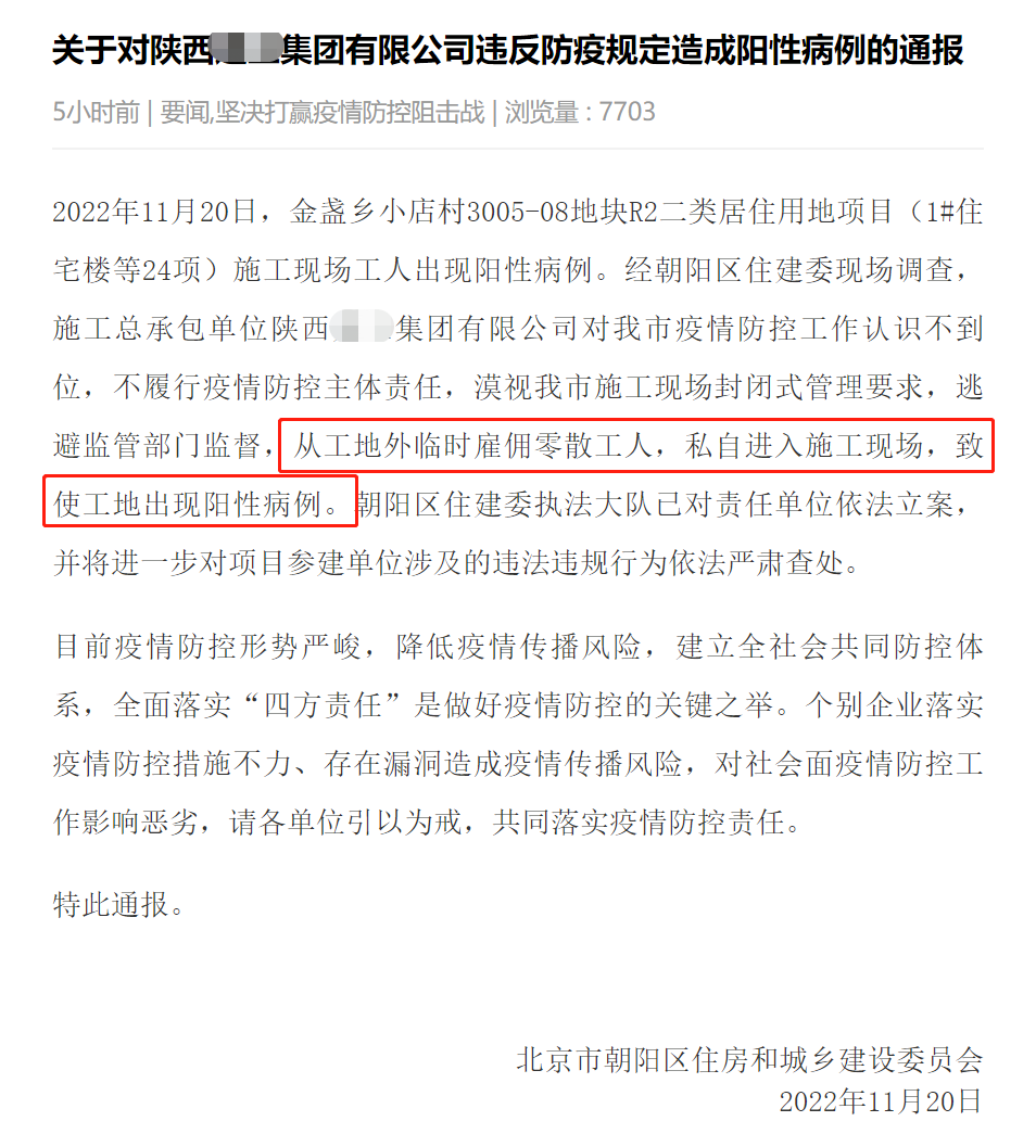 2022年11月20日,金盞鄉小店村3005-08地塊R2二類居住用地項目(1#住宅樓等24項)施工現場工人出現陽性病例。經朝陽區住建委現場調查,施工總承包單位陜西XX集團有限公司對我市疫情防控工作認識不到位,不履行疫情防控主體責任,漠視我市施工現場封閉式管理要求,逃避監管部門監督,從工地外臨時雇傭零散工人,私自進入施工現場,致使工地出現陽性病例。朝陽區住建委執法大隊已對責任單位依法立案,并將進一步對項目參建單位涉及的違法違規行為依法嚴肅查處。