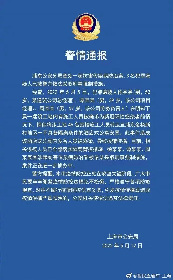 據上海市公安局通報經查,5月5日,犯罪嫌疑人徐某某(男,53歲,某建筑公司總經理)、譚某某(男,39歲,該公司項目經理)、周某某(男,57歲,該公司勞務負責人)在明知下屬一建筑工地內有施工人員被確診為新冠陽性感染者的情況下,擅自將該工地46名密接施工人員轉運至不具備隔離條件的酒店式公寓安置。造成該酒店式公寓內多名人員被感染,導致疫情傳播。