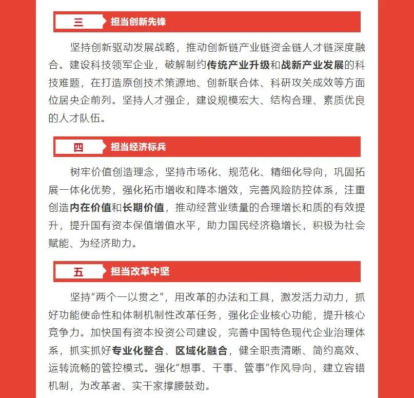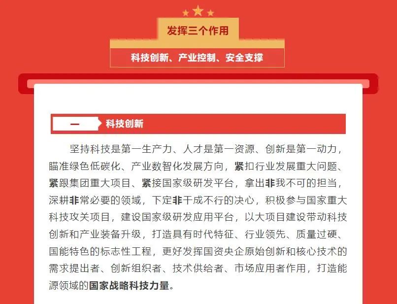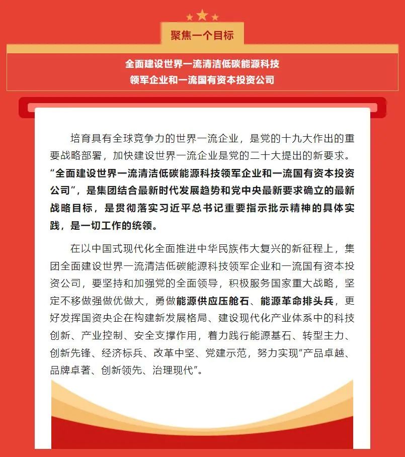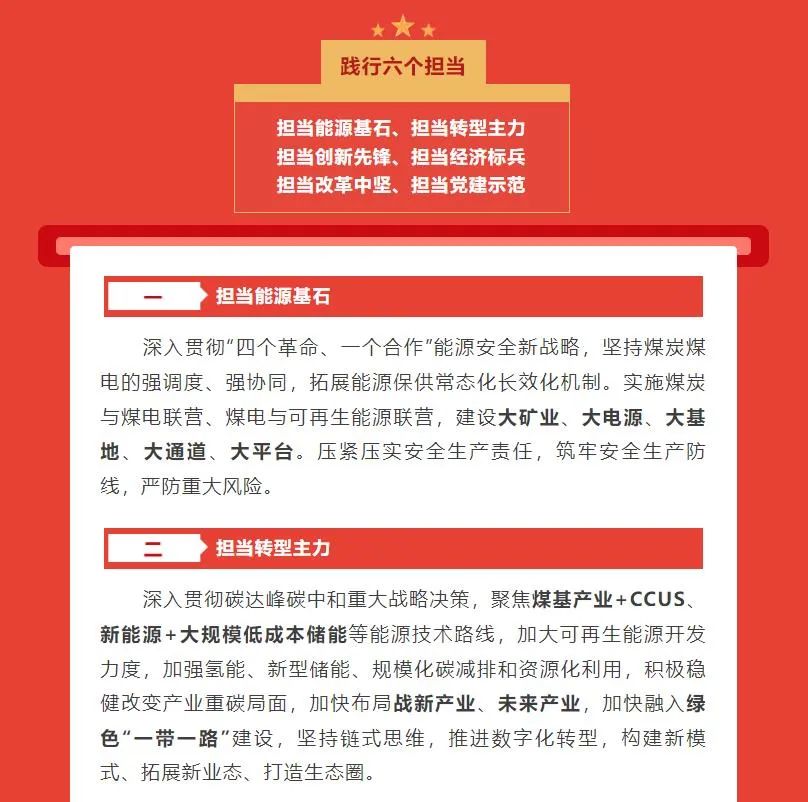 國(guó)家能源集團(tuán)最新確立了“一個(gè)目標(biāo)、三個(gè)作用、六個(gè)擔(dān)當(dāng)”發(fā)展戰(zhàn)略。一個(gè)目標(biāo)是指“全面建設(shè)世界一流清潔低碳能源科技領(lǐng)軍企業(yè)和一流國(guó)有資本投資公司”,三個(gè)作用是指發(fā)揮科技創(chuàng)新、產(chǎn)業(yè)控制、安全支撐作用,六個(gè)擔(dān)當(dāng)是指擔(dān)當(dāng)能源基石、擔(dān)當(dāng)轉(zhuǎn)型主力、擔(dān)當(dāng)創(chuàng)新先鋒、擔(dān)當(dāng)經(jīng)濟(jì)標(biāo)兵、擔(dān)當(dāng)改革中堅(jiān)、擔(dān)當(dāng)黨建示范。