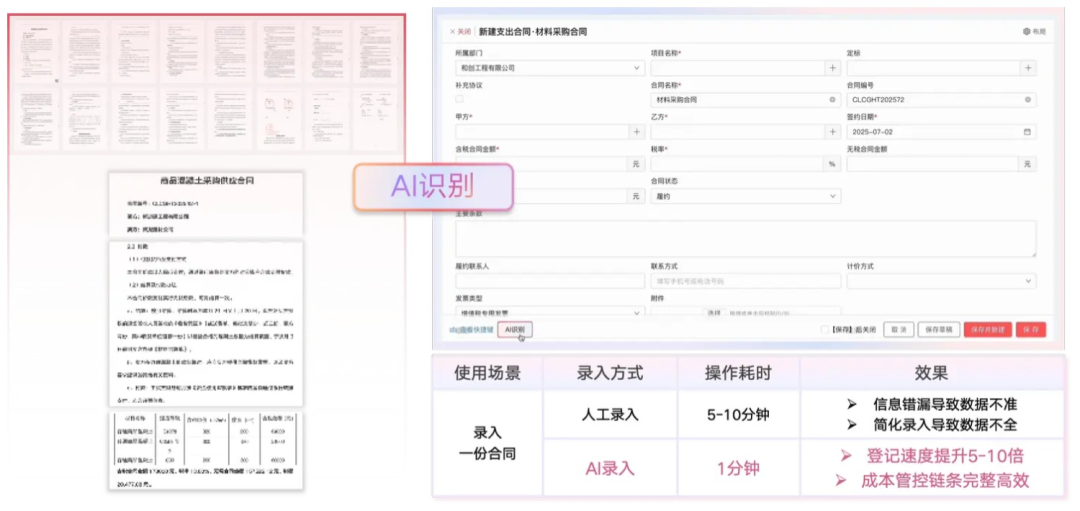 大量手寫確認單、混凝土票據、支出合同、機打送貨單和辦公登記表的錄入任務,不管是在出差途中或辦公場景中,員工只需將紙質單據拍照上傳,即可實現(xiàn)一鍵識別與系統(tǒng)自動錄入,徹底擺脫繁瑣工作、減少重復勞動。