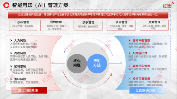在企業(yè)的運(yùn)營(yíng)脈絡(luò)中,印章雖小,卻承載著沉重的法律責(zé)任與經(jīng)濟(jì)風(fēng)險(xiǎn)。面對(duì)合同協(xié)議繁多、應(yīng)用場(chǎng)景復(fù)雜的業(yè)務(wù)環(huán)境,特別是對(duì)于建筑工程類(lèi)企業(yè)而言,依賴(lài)人工管理的傳統(tǒng)用印模式已顯疲態(tài),在風(fēng)險(xiǎn)控制與運(yùn)營(yíng)效率方面捉襟見(jiàn)肘。基于對(duì)建筑行業(yè)數(shù)字化進(jìn)程的深刻洞察,紅圈軟件推出了「智能AI印控一體化解決方案」,旨在以科技創(chuàng)新驅(qū)動(dòng)管理變革,引領(lǐng)企業(yè)實(shí)現(xiàn)用印流程全面、徹底的數(shù)字化與智能化轉(zhuǎn)型。